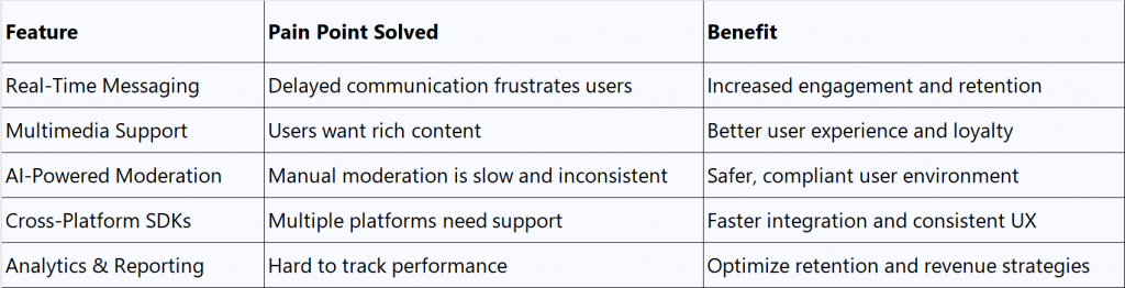 Enable chat types, multimedia sharing, read receipts, and AI moderation.