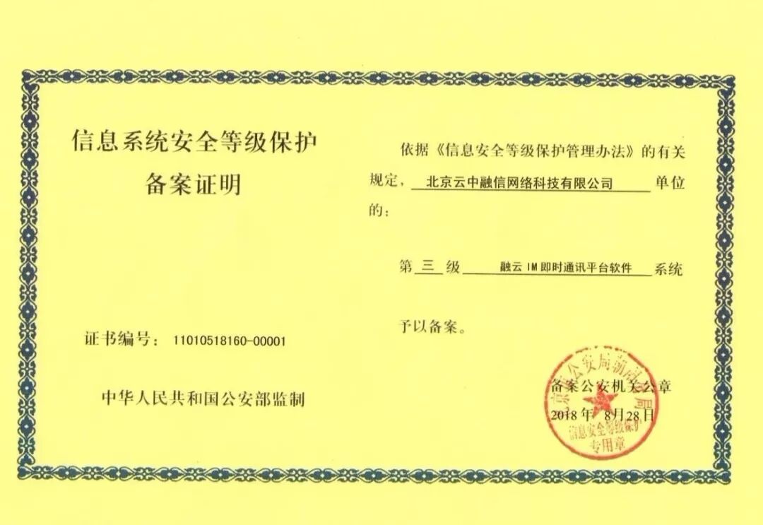 近日,融云IM即时通讯平台软件在主机安全、应用安全、数据安全及备份恢复、安全管理制度、安全管理机构、人员安全管理、系统建设管理、系统运维管理等方面以高分成绩通过国家信息系统安全等级评测。标志着融云平台在安全规章制度、信息基础设施和数据保护等方面,得到了国家的认可。